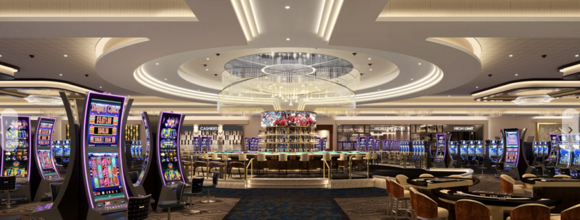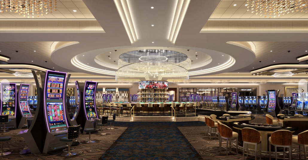 Mediterranean architecture surrounds the gaming space, featuring 1,000 slot machines, poker, blackjack.