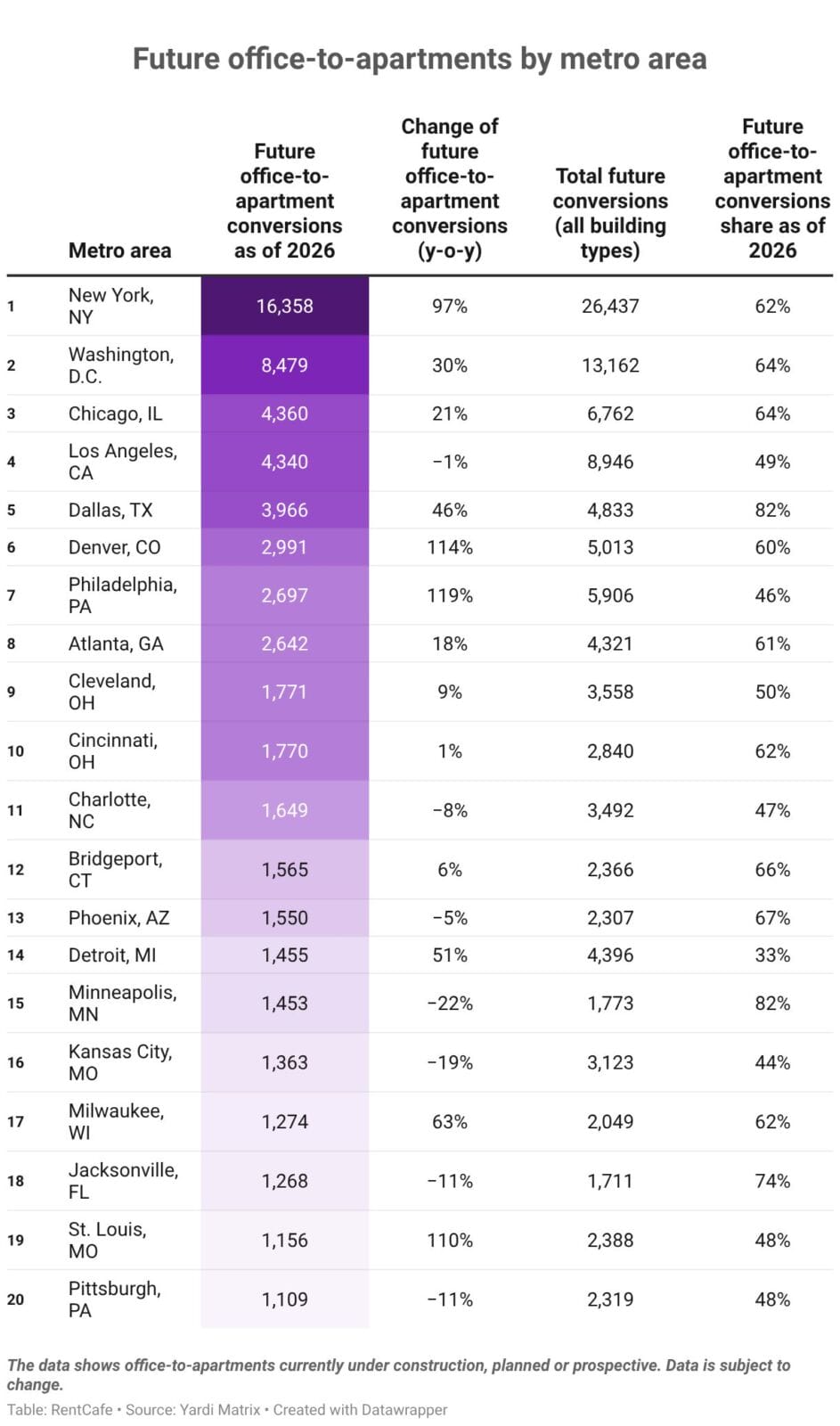 - The national office-to-apartment conversion pipeline reached 90,300 units at the start of 2026, up 28% year-over-year and nearly four times larger than in 2022.